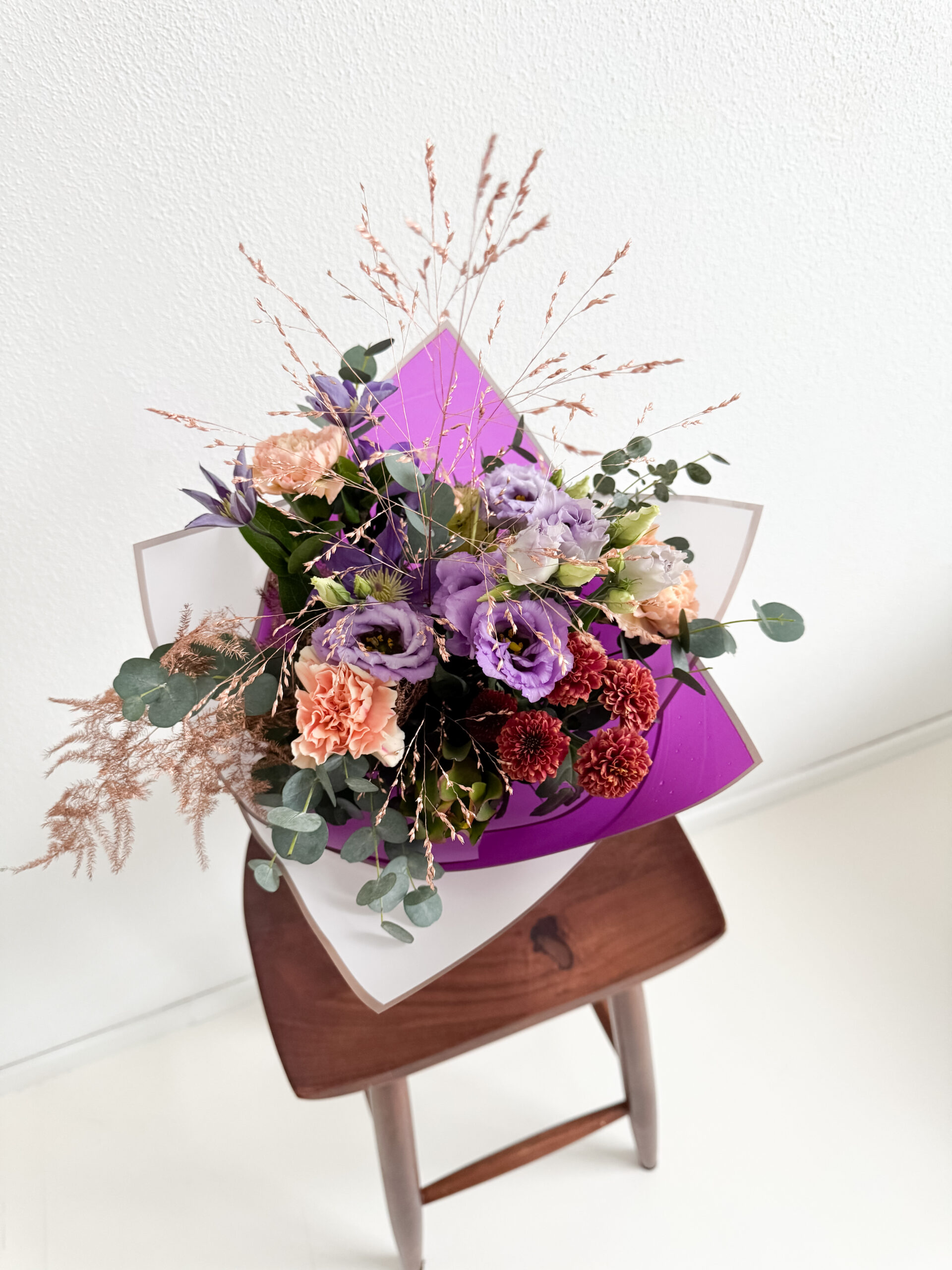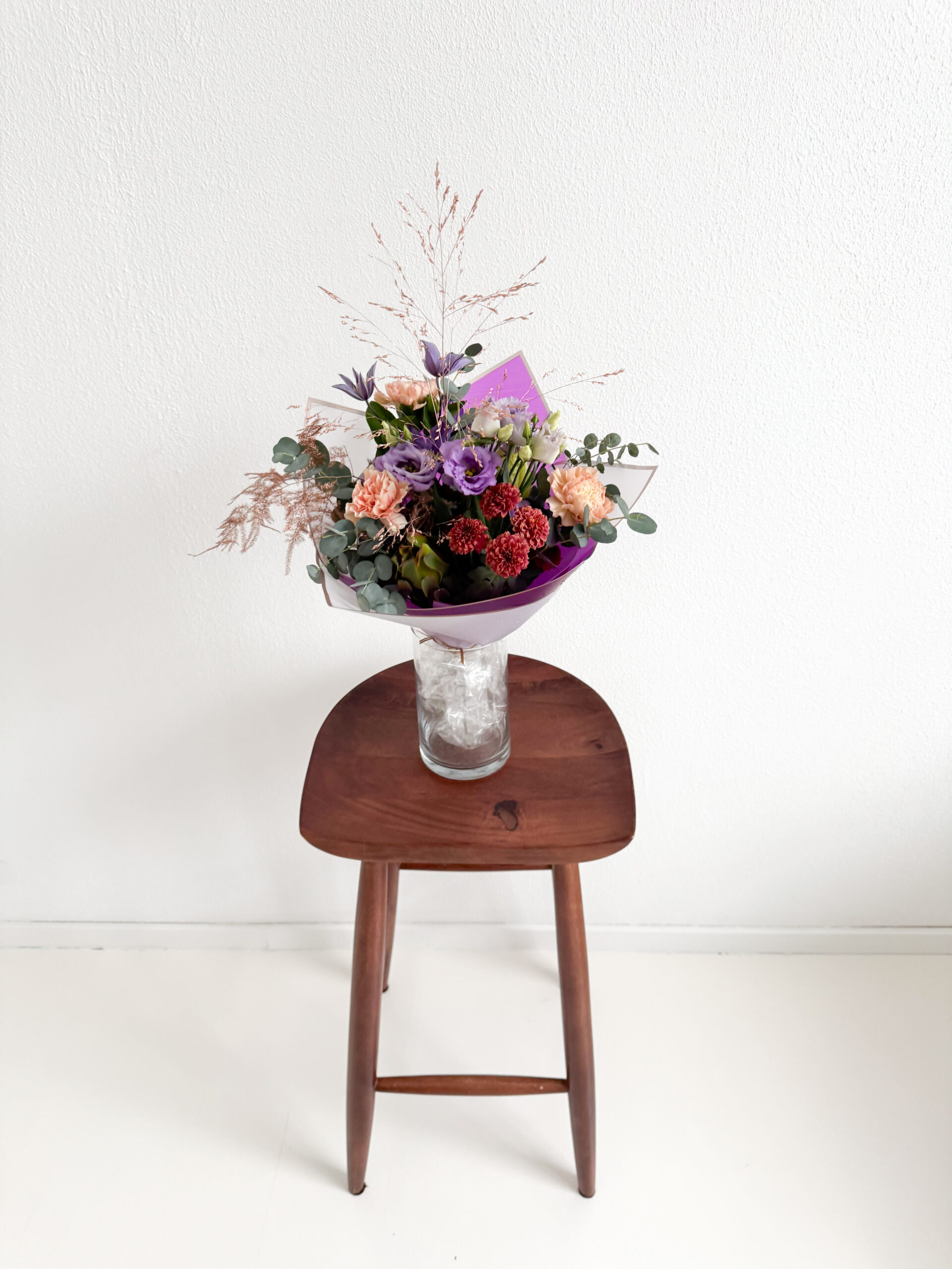 Donna disainkimp ühendab eukalüpti roheluse, nelkide pehme tekstuuri ning harmoonilise lillade ja roosade toonide paleti. Tulemuseks on kunstipärane ja tasakaalus kimp, mis loob isikupärase ja modernse visuaali. Lilled kimbus floristi valikul.